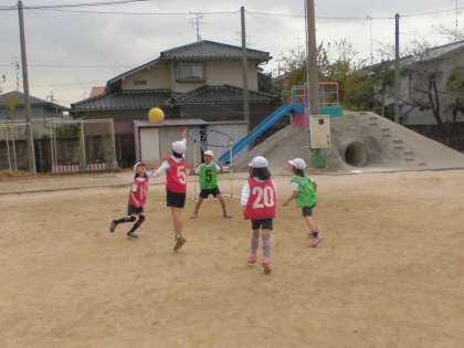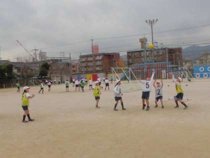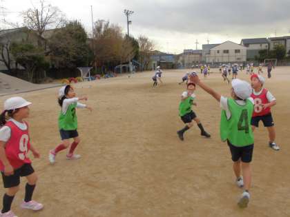 2年生の体育はパスゲームです。パスをみんなでつなぎながら、ゴールを目指します。自分たちで作戦をしっかり立てながら、がんばってくださいね!
