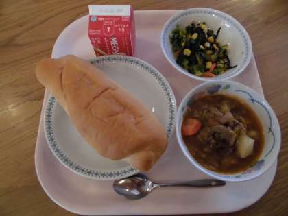 今日はとっても寒い一日でした。そんな日に嬉しい牛肉とじゃがいも,野菜たっぷりの「ボルシチ」は冷えた体を温めてくれるおかずでした。よく煮込まれた野菜からあまみとうまみがでていました。副菜は旬の小松菜をコーンと人参を一緒にソテーしたものが出ました。温かいものをいただくとほっと気持ちが落ち着きますね。ランチルーム給食は5年3組でした。今日もおいしい給食ごちそうさまでした♪