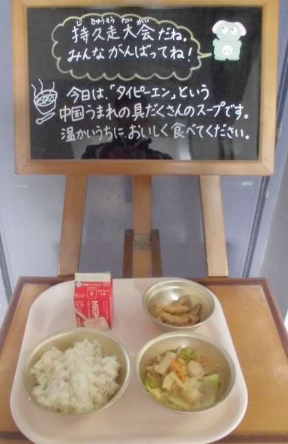 今日の給食は、N留先生おすすめ献立のタイピーエンが昨年に引き続き登場です。