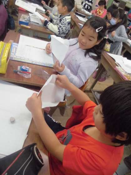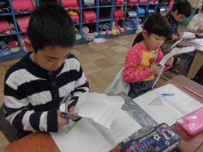 今日の算数は、四角形の角はどのような形をしているかを調べました。折った紙をハサミで切って、三角定規の角の大きさと比べながら調べてみました。ただ、折るのは上手に折れたのですが、ハサミで切るのが・・・。本当は直角になりま—す!!