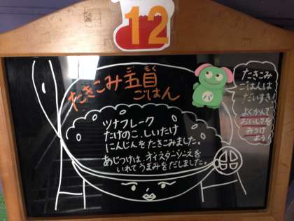 今日の「炊きこみ五目ごはん」は台風に備えて学校で保管しておいた米や缶詰,乾そう野菜,ツナフレークを使って作りました。川岡小学校では3つの釜を使って炊きこみごはんを炊きました。子どもも大人も大好きな炊きこみごはんです。♪「もっとおかわりが欲しい!」という声をたくさんのクラスから聞きました。釜で炊くごはんならではの「おこげ」もでき,もちもちっとした香ばしい味を楽しみながらぺろりといただきました♪