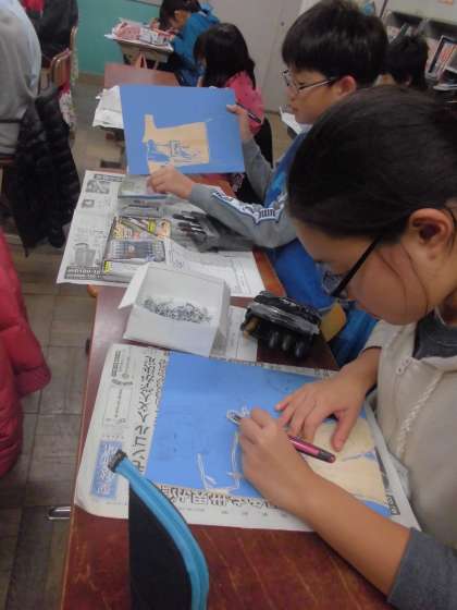 6年生は図工の時間に版画に取り組んでいます。版画の題材は「組体操」です。みんなでがんばった運動会を思い出しながら、一生懸命彫刻刀で彫り進めています。どんな作品ができあがるのか楽しみですね。