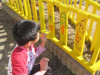 せっかく芽生えたカブの葉っぱが、すっかり鳥たちに食べられてしまったので、管理用務員さんが、たんぽぽの畑に とても立派な柵を作って下さいました。黄色いその柵に子どもたちが思い思いの絵を描き込み、楽しく変身を遂げた たんぽぽ畑です。