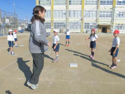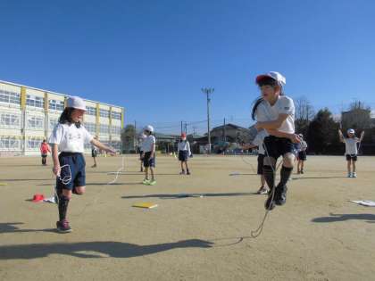 2年生の体育は、なわとびをしています。両足跳びやあやとび、かけ足跳びに二重跳びなど、いろいろな跳び方に挑戦しています。回し方や跳び方を工夫しながらリズミカルに跳べるといいですね!