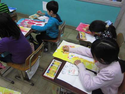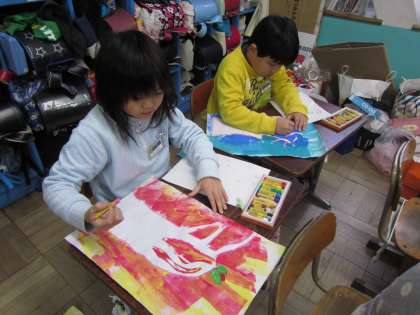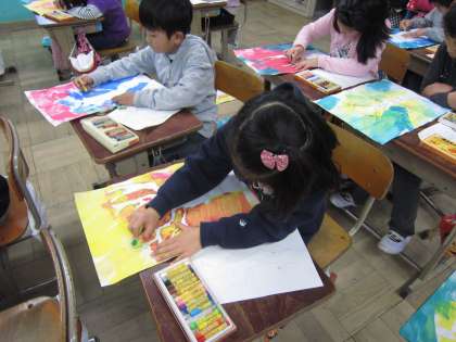 図工の時間に版画をしました。今日はクレパスで葉っぱを描いたり、木の模様を描いたりしました。どんな作品ができあがるかな?