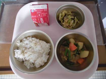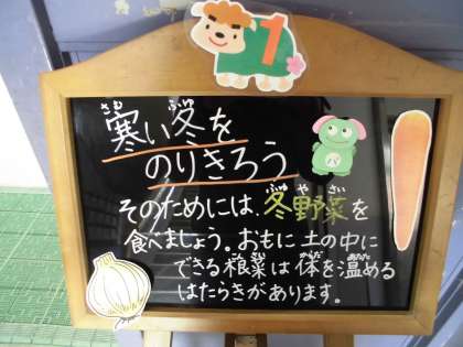 今日は野菜をたっぷり使ったこんだてでした。今日の朝納入された生鮮野菜は,キャベツ,にんじん,玉ねぎ,じゃがいもです。「霜が降りると野菜が甘くなる」と言われるようにどの野菜も甘く,また甘さだけでなく,それぞれの野菜の味が濃くとてもおいしくいただきました。畑で育つ冬野菜は凍らないように糖を分泌するために甘みがぐんと増すようです。根菜や白菜,ねぎ等,旬の野菜をおいしく食べて風邪知らずの元気な体を作りましょう♪