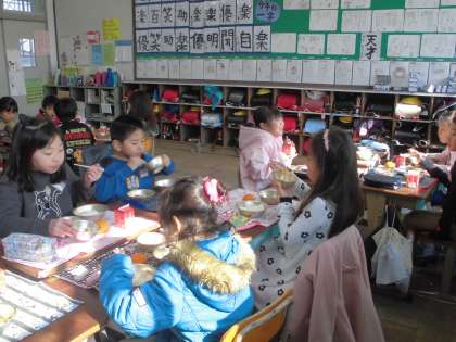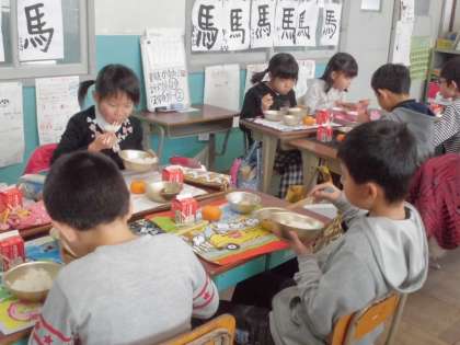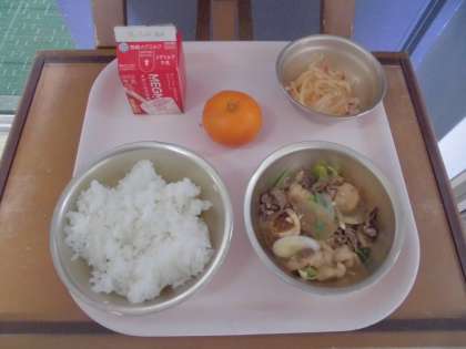 今日の献立の「紅白なます」は、金時にんじんの赤い色と大根の白い色で、お正月の「めでたさ」を表しています。酢で味つけられたなますは、甘い味つけのすき焼風にといっしょに食べるとさらに食欲をかきたてる一品でした。