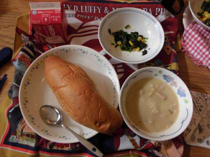 今日は温かいクリームシチューでした。ミルクの代わりに豆乳を加えて作ったルーでシチューを仕上げました。こくのあるまったりとした口当たりがとてもおいしかったです。じゃがいもはほくほくしていて甘く,からまったルーとともにおいしくいただけました。