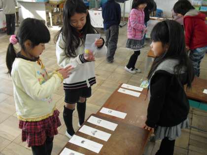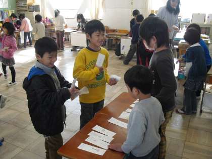お店の準備が整ったところで,いよいよ開店です。お目当ての商品に向かって,「こんにちは!」と元気な挨拶から始まります。お店番の皆も,お客さんが来ると,練習の成果を発揮して,しっかりとした受け答えができました。