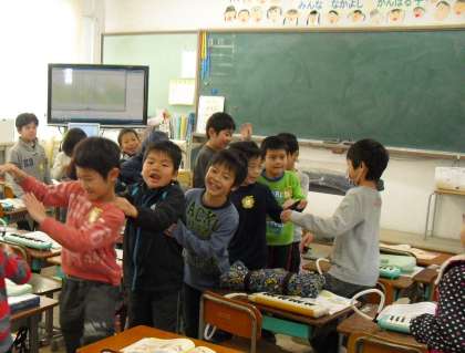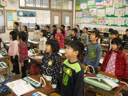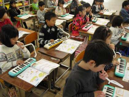 歌声を遠くに飛ばす練習では,みんな笑顔で伸びあがって歌いました。気持ちよく歌い終わった後のけんばんハーモニカの演奏でも,一音ずつ一小節ずつと少しずつ練習を積んでステップアップ,最初から最後まで吹けた時は,大歓声です。ラストは子猫になって踊りました。自分たちで工夫しながら,テンポに合わせてステップを踏んだり手を振ったりしていました。