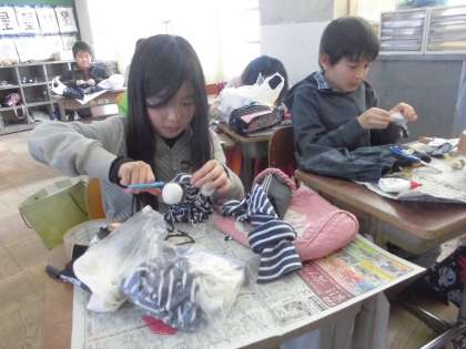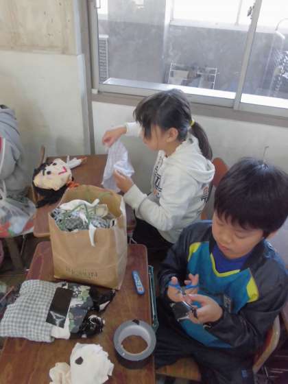今日の図工は「布から生まれた」です。家から持ちよった材料を使って、人形や動物をつくっていきます。どんな生き物が生まれるかな?