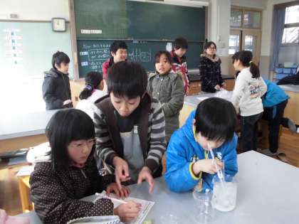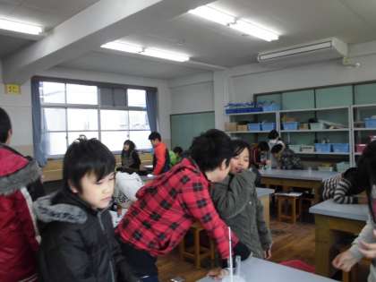 今日は,「水を冷やし続けるとどうなるのか,水の様子と温度を調べよう」のめあてで実験しました。ただでさえ広くて寒い理科室ですが,実験のため暖房も入れられず,みんなジャンバーを着てスタンバイしました。ビーカーの中に氷と水と食塩を入れ試験管の水を冷やしました。そして1分ごとに試験管の中の水が凍っていく様子と水の温度を記録しました。20分くらい実験しました。寒かったけど,水が凍っていく様子がよくわかりましたね。