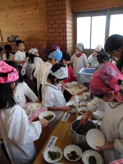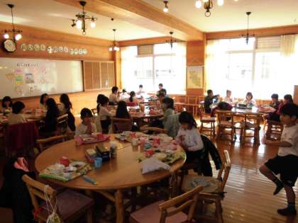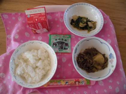 今日は,ほくほくしたじゃがいもが入った「肉じゃが」でした。給食室の釜を2つ使い,約300人分ずつ炊きます。給食室の釜が鉄釜であること,一度に作る量が多いこと,愛情をたっぷり入れて作ることでとてもおいしい「肉じゃが」が出来上がります。「2日目の肉じゃが」のように食材に味がなじみ,まとまっています。副菜やごはんとともにおいしくいただきました♪今日のランチルーム給食は2年1組でした。五感で味わいながらおいしく食べていました。川岡レストランで食べる給食は,いつもよりさらにおいしく感じるね♪