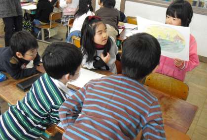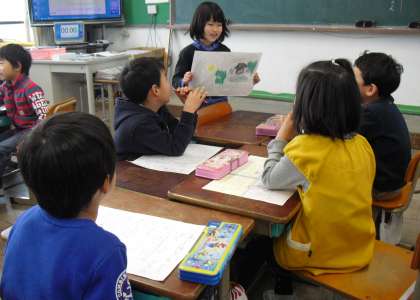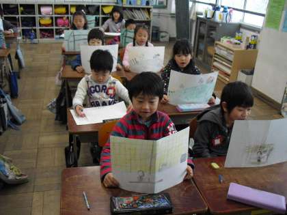 「たぬきの糸車」の紙芝居をグループで発表しました。場面ごとに,自分で考えた文や台詞を付け足して読みます。聞き手の皆も集中して,友だちの工夫を見つけながら聞くことができました。