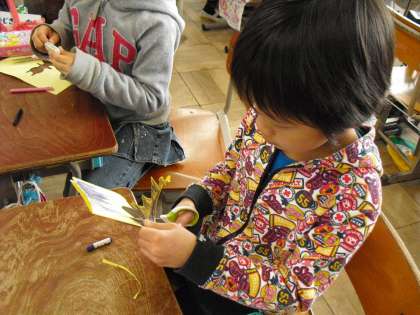 「こんないきものがいたらいいな,こんなものがあったらいいな」というゆめのまちを作ります。どう切ったら立つのかを考えるのは少し難しかったですが,想像力を働かせながら作り上げていきました。