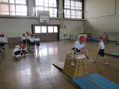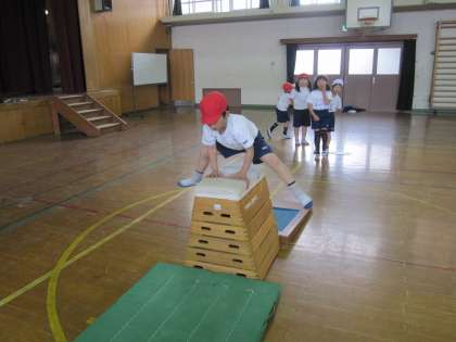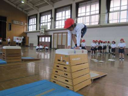 今日の体育は、ねらい1の時間に「またぎのり、またぎおり」と「とびあがり、とびおり」に挑戦し、ねらい2の時間には、その2つのとびこし方で4段、5段に挑戦しました。みんな、かっこいいね!!