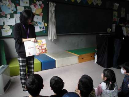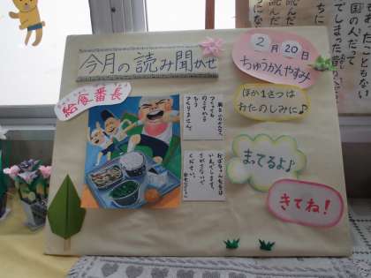 今日の読み聞かせは,「給食番長」と「やまださんちのてんきよほう」でした。「給食番長」は,九州の福岡の方言で書かれた絵本でしたが,読み聞かせの方が同じ九州の方で,とっても上手に読み聞かせをされてありました。迫力のある言葉と絵の力で,子どもたちも楽しそうでした。