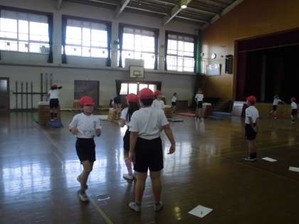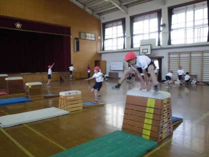 今日も「体ならし」をした後,ねらい1「今できる技」ねらい2「少しがんばればできる技」に挑戦して楽しみました。自分のめあてに向かってがんばってとんでいました。