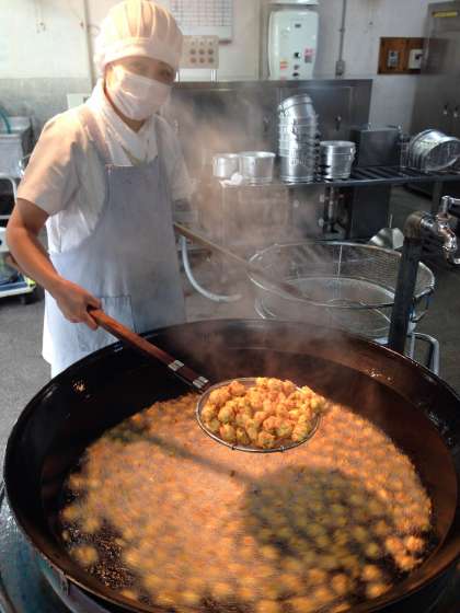 今日は給食室手づくりの「がんもどき」でした。給食のがんもどきはとうふとおから,鶏ミンチをよく練り混ぜ,干ししいたけ,にんじん,枝豆を入れて,一口の大きさにして油であげました。揚げたてのがんもどきは周りが少しカリッとしていて,中はふわふわです。だしのきいたとろりとしたあんをからめていただきました。手づくりのよさが伝わるやさしい味でした。ごはんや豚汁もとも相性がよく,子どもたちはおなかいっぱいおいしく食べていました♪