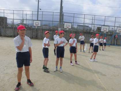 6年生の体育はジョギングです。自分の脈をとりながら、身体の様子を知り、運動の強度をかえていきます。音楽を聴きながら、自分に合ったペースで走り続けます。サッカーの試合前みたいに見えますが、実は脈をとっているところでーす!
