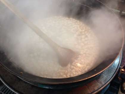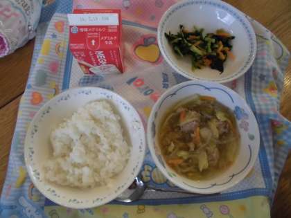 今日は,手づくりの肉団子が入った具だくさんの「スープ煮」でした。湯を沸かした釜に,豚ひき肉で作った団子を一口の大きさにしながら落としていきます。その数,約2300個。そこへキャベツ,もやし,はるさめ,にんじんをいれて,塩こしょうとしょうゆで味つけしました。豚肉のうまみたっぷりのふわふわで柔らかい肉団子を子どもたちは嬉しそうに食べていました♪今日のランチルーム給食は3年2組でした♪ランチルームで食べるクラスはおかわりが少し多めです。嬉しいね♪