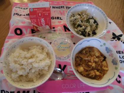 今日のおかずは,中国料理の「とうふの四川風」と韓国朝鮮料理の「ナムル」でした。「とうふの四川風」はケチャップと豆板醤で味つけされ,スパイシーでごはんがすすむ味でした。副菜は,切干大根ともやし,ほうれん草をごま油・砂糖・しょうゆ・米酢でさっぱりといため,たっぷりの野菜が食べられました。ご家庭でもお手軽に作れる一品ですので,ぜひお試しください♪今日のランチルーム給食は3年3組でした。