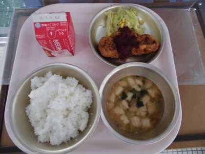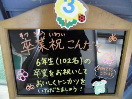 今日は,卒業祝の行事こんだてでした。6年生の卒業をお祝いして,給食室で1枚ずつ心をこめて作った「とんかつ」をいただきました。6年生のみなさんは,6年間で約1150回もの給食を食べてきました。心も体も成長した子どもたち。これからも「食べること」を大切に,中学校生活を送ってほしいです。さくさくのとんかつおいしかったね♪今日のランチルーム給食はたんぽぽ学級でした。食事のマナーを守り,おいしい食べ方でおなかいっぱいいただきました。ごちそうさまでした♪