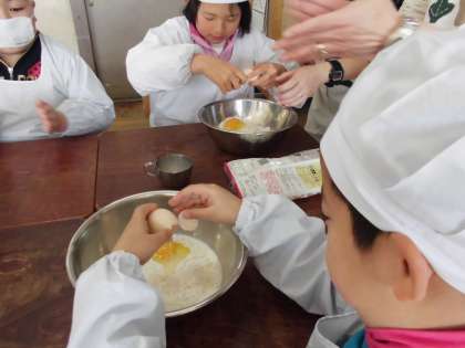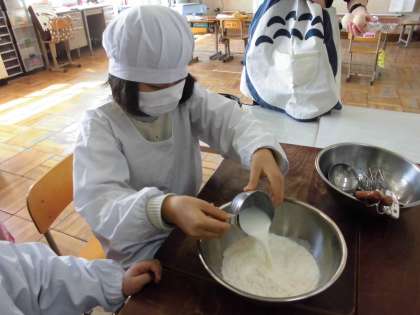 ボールに,ホットケーキミックスと牛乳・卵を入れて,かき混ぜます。