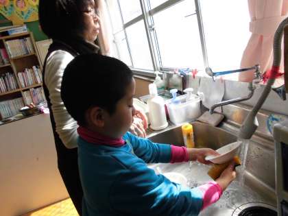 あっという間に食べ終わり,自分の使った食器を洗って片付けます。