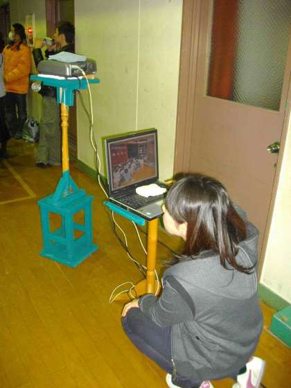 昨日管理用務員さんに急遽作っていただいたパソコン台とプロジェクター台が大活躍。最後の場面転換で,体育館の背面に『みさきの家』での活動の様子が映し出されました。この間に4年生は,フィナーレの隊形に素早く並びました。