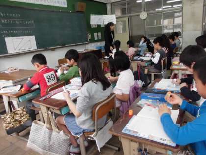 4年生の授業は算数です。今日の学習のめあては「三角定規で,いろいろな角をつくろう」です。うまくつくれるかな?