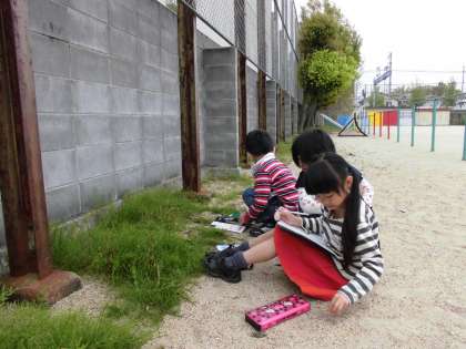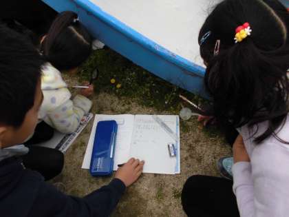 今日は曇りの天気で肌寒い中,虫眼鏡を使って校庭に咲いている花や葉・茎の様子をくわしく観察しました。葉や茎に生えている細かな毛や手触りなど,気付いたことも発見できたらいいですね!
