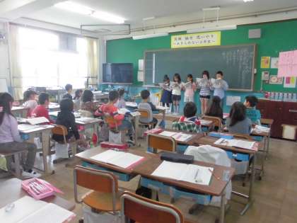 3年生の授業は,国語の音読発表会でした。めあては,「友だちの工夫しているところを見つけよう」です。たくさんの工夫しているところを見つけられたかな?