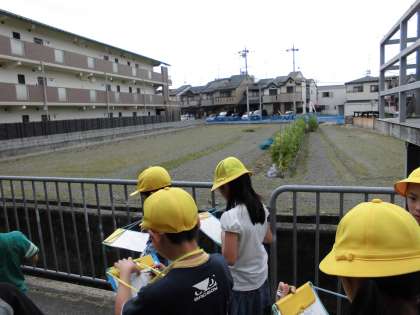 社会科の学習で校区たんけんに行きました。今回は、学校から見て東の方角を歩いて、まちの様子を調べました。学校に帰ってから、見つけた神社や畑を校区の白地図に地図記号で書き込みました。次回は西の方角をたんけんします。
