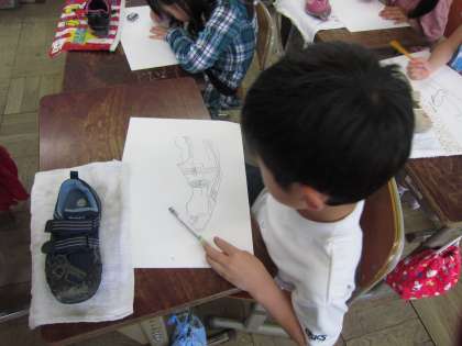 今日の図工は,自分のはいているスニーカーをよく見て,スケッチをしました。細かいところまで見て,上手に形をとりながらかくことができました。