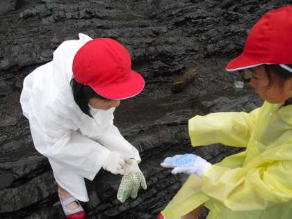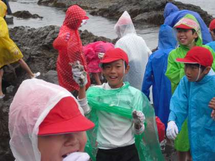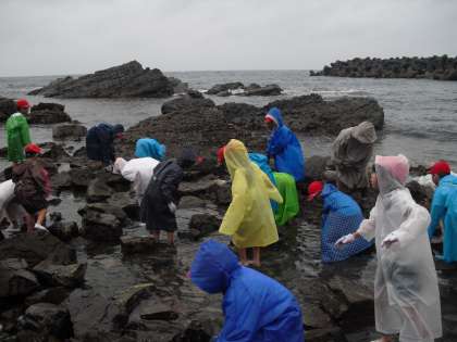 磯観察にいきます!雨ですが、生き物をとったり、貝殻をみつけたり楽しんでいました。