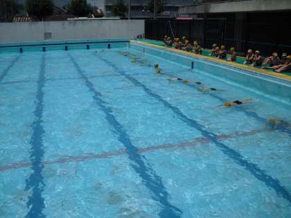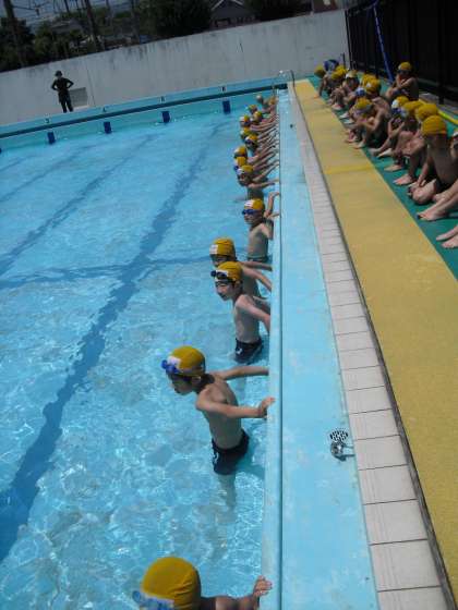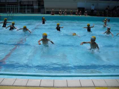 2年生の体育は水あそび。顔をつけて水中じゃんけんをしたり、全身の力を抜いてクラゲのように浮いたりと、みんながんばっています。