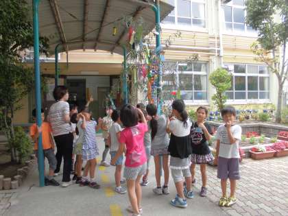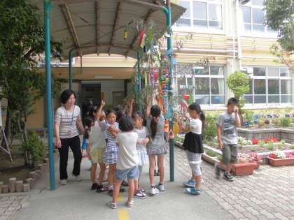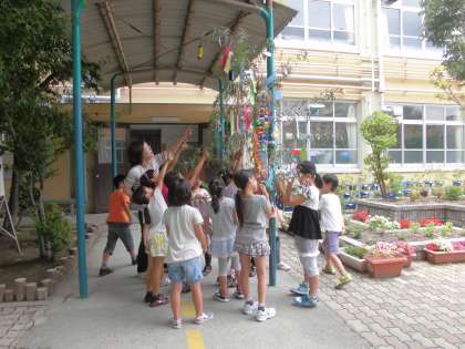 恒例の笹かざりを作っています。それぞれの「ねがいごと」をたんざくに書いて,笹にかざりました。「家族がみんなけんこうですごせますように」や「しょうらい○○になれますように」や「かしこくなれますように」などいろいろなたんざくがありました。かなうといいですね。
