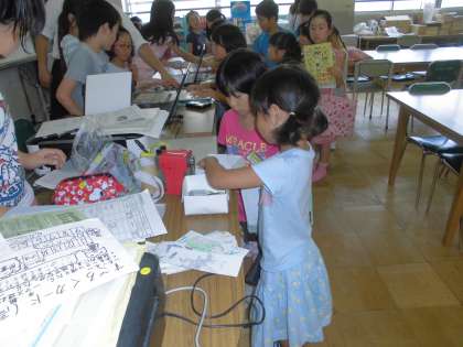 中間休みの図書室です。本の借換えに来る人がたくさんで長い列ができていました。また,図書委員会がクイズをしてくれていて,正解をすると「しおり」がもらえました。