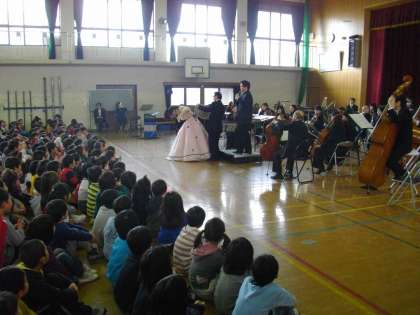 前回のワークショップでもびっくりしたソプラノ歌手の歌声を,オーケストラの演奏とコミカルな劇仕立てで楽しみました。