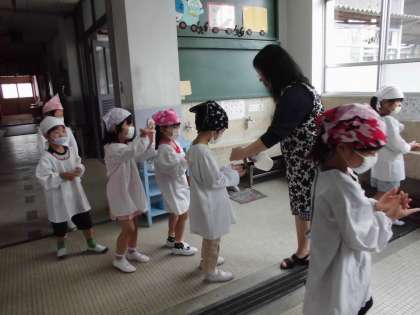 今日から給食も始まりました。きょうの献立は,「ごはん・牛乳・肉みそいため・とうふと青菜のスープ」です。「肉みそいため」は,ごはんによく合うおかず子どもたちに人気があります。「とうふと青菜のスープ」は,チキンののうま味があっさりしていて,おいしくいただきました。
