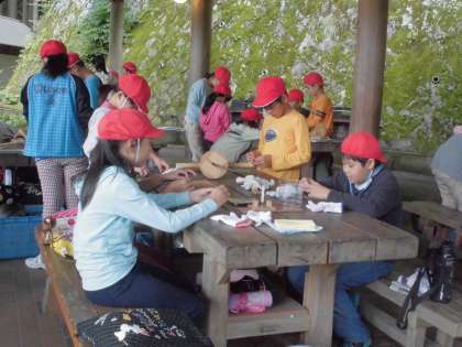 野外炊事場では,まず,「火おこし」です。「火おこし」の道具の使い方と火のつけ方を教わって,さあ,チャレンジです。まっすぐに道具を動かすのがむずかしそうでした。