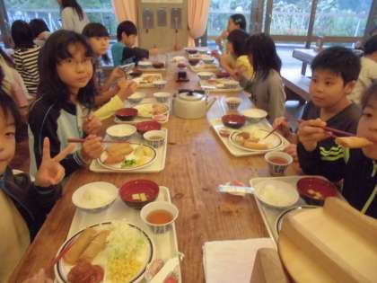 お風呂を済ませて,17:30から夕飯です。バイキング形式で,自分で選べるのがうれしいです。がんばったので,お腹がへったことでしょう。さあ,お腹いっぱい食べましょう。「いただきまーす!」