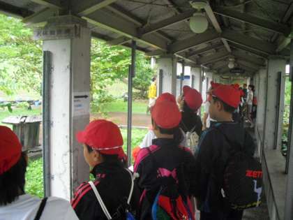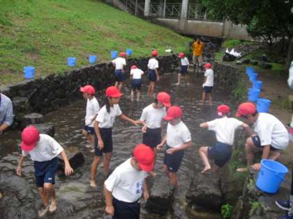 1つ目の活動は「魚つかみ」です。朝,起きた時にはとても雨が降っていたので,心配しましたが,やんでよかったです。魚は泳ぐのがとても速くて,つかまえるのは,なかなかむずかしいです
