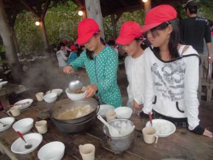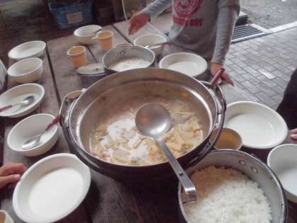 お昼ご飯は,2回目の野外炊飯で,「豚汁・ご飯」をつくりました。2回目なので,慣れているはずですが,雨で新聞紙がしめっていたせいか,火がつきにくて苦労した班やご飯がこげてしまった班などいろいろありましたが,無事終わって「ごちそうさまでした!」