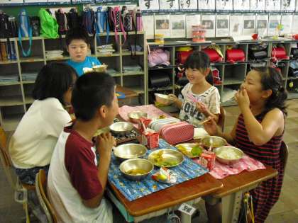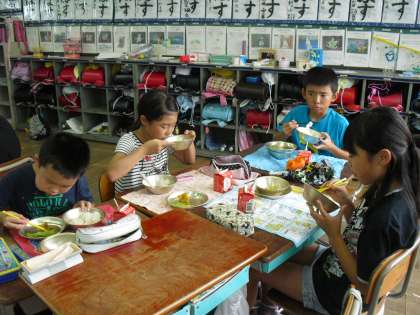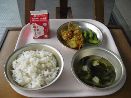 今日の給食のメイン料理は、夏野菜のかきあげです。夏の太陽の日差しをたっぷりと浴びて育った夏野菜は、甘さやうまみ、ほんのりとした苦味がぎっしりとつまっています。子どもたちが苦手なゴーヤもカボチャの甘さ、にんじんやちくわのうまみと混ざりあって、とってもおいしい味付けになっていました。今日もみんなでおいしくいただきました。ごちそうさまでした!!