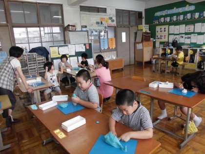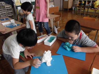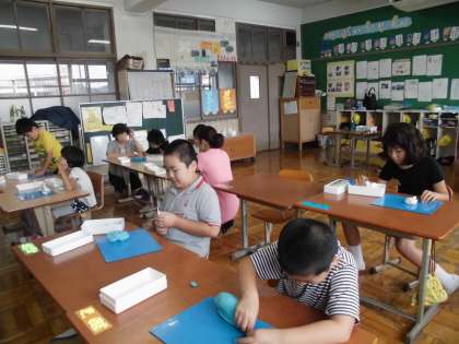 三時間目は,図画工作です。粘土を使って好きなものをつくりました。それぞれ「わに」「おだんご」「電車」など自分の好きなものをつくり,何をつくったのか発表しました。