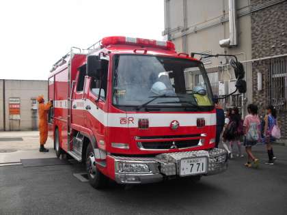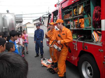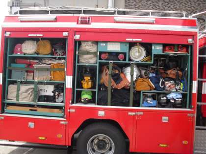 レスキュー隊に会えました!たくさんの道具が積まれています。