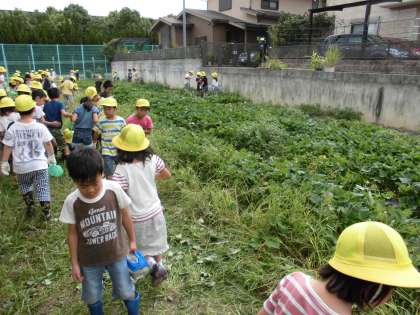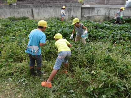 今日はみんなで大事に育てているお芋畑に行って、虫とりをしました。大きく育ったさつまいものツルと伸びに伸びた雑草に囲まれた畑には、バッタやカマキリ、コオロギなどたくさんの昆虫を捕まえることができました。さあ、これからどんな学習になるのかな?
