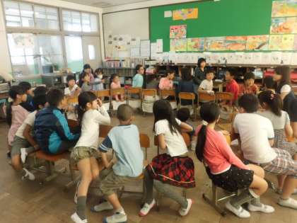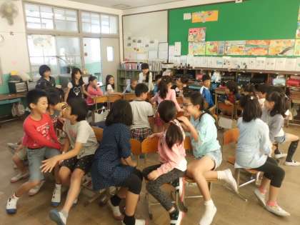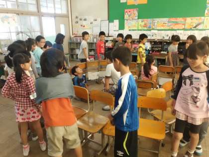 遊び係が「いすとりゲーム」を企画しました。クラスみんなで遊んでいます。けがをしないように,歩いてゲームをしています。
